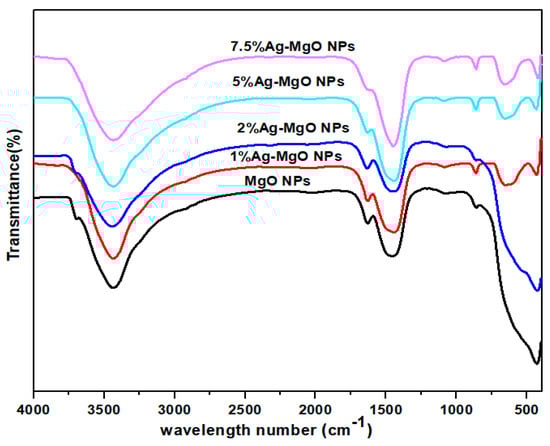 FTIR spectra of pure, 1%Ag -MgO, 2% Ag-MgO, 5% Ag-MgO, and 7.5% Ag-MgO NPs.