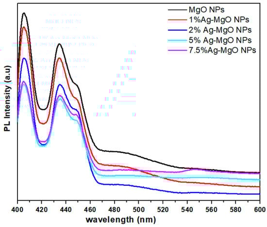 The photoluminescence (PL) spectroscope is a significant tool to investigate the electron-hole recombination rate of NPs. Figure 8 illustrates the PL spectra of both pure MgO NPs and Ag (1%, 2%, 5%, 7.5%)-MgO NPs at an excitation wavelength of 385 nm []. The peaks at 404 nm, 434 nm, and 450 nm are observed in all samples. However, the intensity of all peaks decreased with increasing concentrations of Ag dopant []. Lower intensity of Ag-doped MgO suggests a significant migration of charge carriers (electrons and holes) from the inner part to the surface of NPs; hence, they can then participate in surface redox reactions. This phenomenon is very important for enhanced photocatalytic activity [].