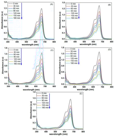 The UV light absorbance of MB solutions as a function of irradiation time (A) pure MgO NPs, (B) 1% Ag, (C) 2% Ag, (D) 5% Ag, (E) 7.5% Ag-doped MgO NPs.