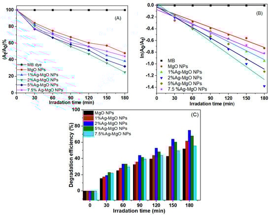 In the present work, MB dye was used as a model pollutant to measure the photocatalytic activity of pure MgO NPs and Ag (1%, 2%, 5%, 7.5 mol%)-MgO NPs under UV irradiation. Figure 9A–E illustrates the UV–vis absorption spectra of MB dye with pure MgO NPs and Ag-doped MgO NPs. Degradation of MB dye following exposure of synthesized samples was determined by the intensity of the decay of the characteristic absorption peaks around 664 nm as a function in irradiation time (t). Every 30 min, the intensity of the absorption peak was decreased, and the blue MB dye solution turned colorless after 180 min, as shown in this report []. As shown in Figure 9A,E, there is a small decrease in the intensity of the absorbance peak after 180 min. A recent study also showed the photocatalytic activity of MgO NPs by degradation efficiency of MB dye under UV irradiation []. Figure 10A shows the plot of At/A0 versus time for the degradation of MB dye using pure MgO NPs and Ag-MgO NPs under UV irradiation in the time interval of 30–180 min. Figure 10B also presents the curves relative to ln(A0/At) versus the irradiation time. The photodegradation reactions in the prepared samples are determined by the first-order kinetic rate constant (k). The calculated rate constant (k) of MB dye was 0.0038 min−1, 0.0051 min−1, 0.0072 min−1, 0.0072 min−1, 0.0059 min−1, and 0.0042 min−1 for pure and Ag (1%, 2%, 5%, 7.5%)-MgO NPs, respectively. These values of the rate constant (k) were in agreement with other reports [,,,].