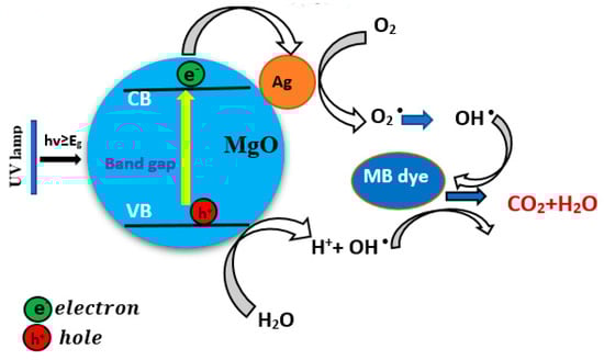 The possible mechanisms of photocatalytic activity of Ag-doped MgO NPs is proposed in Figure 11. Upon UV irradiation, electrons in the valance band (VB) of pure MgO NPs are excited to the conduction band (CB), leaving the same number of holes in the valance band (Equation (3)). The excited electrons can be easily trapped by the Ag dopant and release superoxide radicals () (Equation (4)). Similarly, generated holes in the valance band (VB) cannot attack compounds on surface of materials as well as oxidize water molecules to form hydroxyl radicals () (Equation (5)). Following that, the organic contaminants (MB dye) might be degraded by reactive agents () or be immediately destroyed by holes (h+) (Equation (6)).