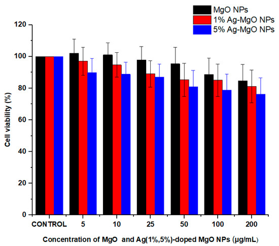 The human umbilical vein endothelial cells (HUVECs) were purchased from ATCC (ATCC, Manassas, VA, USA), USA. The HUVEs were cultured in Dulbecco Modified Broker Eagle medium (DMEM) with 10% fetal bovine serum and 100 U/mL penicillin–streptomycin. Cells were maintained in an incubator with a 5% CO2 supply at 37 °C. The HUVECs cultured were employed in an in vitro study of medical applications. A stock suspension (1 mg/mL) of pure and Ag-MgO NPs was prepared in a culture medium (DMEM + 10%FBS). Different dilutions (5, 10, 25, 50, 100, and 200 µg/mL) were sonicated in a water bath for 20 min to prevent agglomeration of NPs before exposure to cells. Cytotoxicity of pure MgO and Ag-MgO NPs was examined by the MTT assay [] with some modifications [].