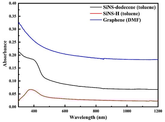 In Figure 2, representative UV-Vis-NIR absorption spectra of the as prepared SiNS–H and SiNS–dodecene dispersions in toluene are presented, all referring to a concentration of 0.1 mg/mL. For comparison purposes, the UV-Vis-NIR absorption spectrum of a multilayered graphene (i.e., 2–5 layers) dispersed in dimethylformamide (DMF) with a concentration of 0.1 mg/mL is also included in Figure 2. As depicted, the absorption spectra of SiNSs appear smooth and featureless throughout the visible and near-infrared regions, exhibiting a characteristic absorption peak in the 350–400 nm spectral region, which is ascribed to transitions occurring from occupied σ to unoccupied σ* states []. An identical morphology can also be observed for the UV-Vis-NIR absorption spectrum of graphene (see e.g., Figure 2), where, in contrast to SiNSs, the 350 nm absorption is attributed to π–π* transitions of the aromatic C=C bonds [].
