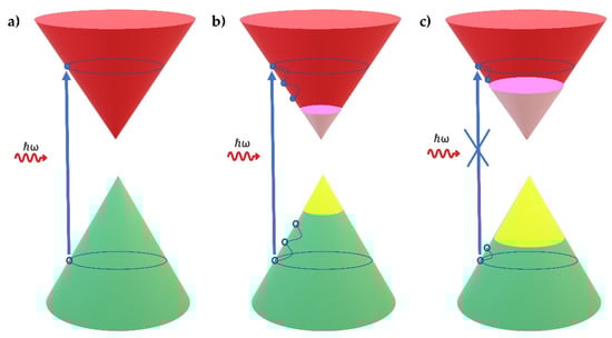 For SiNSs and graphene, electrons from the valence band can be promoted into the conduction band under sufficient laser intensity, while simultaneously empty states (i.e., holes) are generated in the valence band (Figure 4a). As for graphene, it is expected that the photoexcited electron–hole pairs of SiNSs will be converted to hot carriers, which shortly cool down and relax though carrier–carrier and electron–phonon scatterings forming a Fermi–Dirac distribution. In the following several ps, the hot carriers cool down rapidly through relaxation processes, including intraband phonon scattering and electron–hole recombination, thereby building an equilibrium electron and hole distribution (Figure 4b). For graphene, the former relaxation process has been reported to occur in the range of 70–150 fs after excitation, while the latter one occurs in the range of 0.5–2 ps [,]. Concerning the SiNS samples, in a recent study reporting on the ultrafast carrier dynamics of epitaxially grown silicene, it was verified that the previously mentioned relaxation processes take place in several tens to hundreds of fs and ps after photoexcitation, respectively []. The use of a sufficiently high incident laser intensity results in more efficient intraband transitions of charge carries. Therefore, all of the available states lying near the edges of the valence and conduction bands are occupied, blocking any further excitation of carriers due to the Pauli exclusion principle (Figure 4c). This situation implies the quenching of optical absorption being expressed as SA behavior and is known as Pauli Blocking []. This situation, i.e., the saturation of absorption, is a common feature in all graphene-like 2DMs, such as graphene and silicon nanosheets.