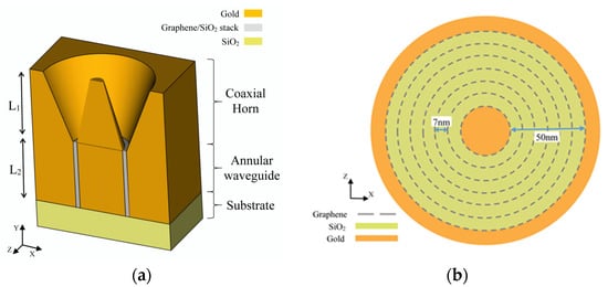 Figure 1a shows a cross section in the proposed configuration of graphene metamaterial embedded within the Bundt optenna. The plasmonic Bundt optenna is made of gold [], and it consists of two stages that are built on a silicon dioxide substrate. The first stage is a tapered coaxial horn with a 2 µm length (L1). At the horn input, the inner and outer diameters are 0.05 and 1.4 µm, respectively, whereas, the inner and outer diameters at the horn output are 0.7 µm and 0.8 µm, respectively, resulting in an annular 50 nm-wide gap. The second stage is a straight waveguide that is 50 nm wide and 1.5 µm long. The graphene metamaterial annular stack is embedded to fill the nano waveguide width. The stack consists of seven concentric cylindrical graphene sheets separated by 7 nm silicon dioxide thin films. The first and last graphene layers are in contact with the waveguide gold inner and outer surfaces. Of course, more graphene layers would enhance the metamaterial absorption further, however, seven layers were enough to fill up the 50 nm-wide waveguide, given that the minimum standard width of the separating thin films is 7 nm. Figure 1b shows a magnified XZ cross section within the waveguide illustrating the cylindrical graphene metamaterial with alternating concentric silicon-dioxide thin films and graphene layers. This device is polarization-insensitive because of the circular symmetry around its central axis. The tapered coaxial horn collects input infrared radiation from free space and excites SPP on the gold surfaces, which are coupled together across the horn gap. The horn squeezes the plasmonic fields gradually down to a sub-wavelength 50 nm-wide spot at the input of the annular plasmonic waveguide. The reduction in the plasmonic field area results in an optical intensity gain. This focused guided infrared plasmonic field propagates along the longitudinal direction of the cylindrical graphene layers until it becomes fully absorbed by the end of the waveguide. The infrared spot propagates tangentially along and in between the graphene layers. Thus, each layer is double-face exposed to focused infrared radiation during propagation.