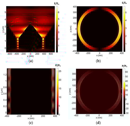 Figure 2 shows the plasmonic fields and power absorption within different parts of the device in the case of TM-polarized incident radiation at a 1476 nm wavelength. This wavelength was selected as it yields a maximum metamaterial absorption, as will be discussed later in Section 3. The fields and power were normalized to the incident source field and power, respectively. Figure 2a illustrates the plasmonic field within an XY section of the whole device. It shows that infrared collection and focusing through the coaxial horn had high values in the vicinity of gold surfaces and the highest field values at the plasmonic waveguide entrance. Therefore, the inner and outer graphene layers were placed in contact with the waveguide gold surfaces to become exposed to these maximum plasmonic fields within the waveguide. The plasmonic field becomes almost negligible by the waveguide end due to complete absorption.