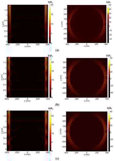 Figure 3 shows the power absorption ratios at the same XY cross section and XZ cross section of the plasmonic waveguide, however, for the other wavelengths. Figure 3a–c corresponds to the wavelengths of 1300, 1600, and 1439 nm, respectively. As seen, the highest absorption was concentrated within the graphene layers with some plasmonic absorption on the waveguide gold surfaces. The wavelength of 1439 nm was selected as it corresponds to the minimum metamaterial absorption, as will be discussed later in Section 3.