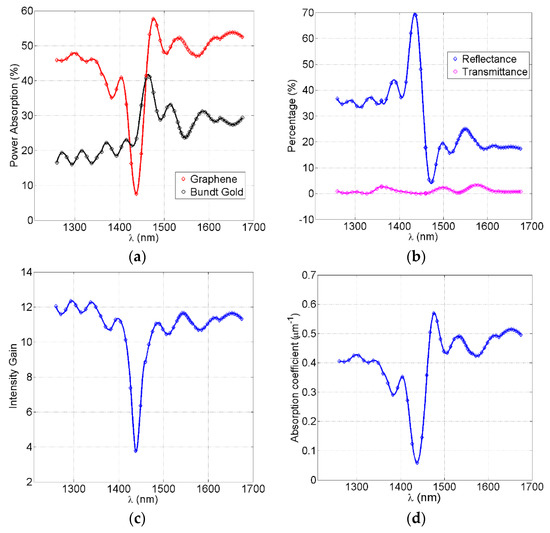 Figure 4c illustrates the gain in infrared intensity due to coaxial feed horn squeezing of both the electric and magnetic plasmonic fields at the coaxial horn output and just before the plasmonic waveguide input. The horn area was downsized from 1.54 µm2 at the input to 0.11 µm2 at the output (i.e., plasmonic waveguide input). After subtracting the gold losses on the horn gold surface, the gain (i.e., enhancement) in the inferred intensity becomes ≅11.5 (i.e., 10.6 dB). Still, the dip in the curve (3.8%) corresponds to the maximum back reflection and thus yields a minimum graphene absorption. The intensity gain at the waveguide input for the 1476 nm wavelength was almost 11 dB, which yielded a maximum absorption after interaction with the metamaterial.