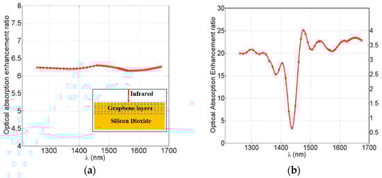 Figure 5b shows the optical absorption enhancement in the case of the graphene metamaterial with a Bundt optenna (presented in Figure 4a). In the figure’s right axis, it is compared to the previous case of the standalone metamaterial. The maximum enhancement was four times (≅6 dB) at a wavelength of 1477 nm. In the figure’s left axis, it was compared to the standard standalone monolayer graphene layer. The maximum enhancement here was 25.1 times (≅14 dB) at a wavelength of 1477 nm.