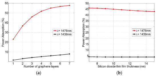 The variations in the metamaterial absorbed power ratio as a function of the number of concentric graphene layers (a), and the thickness of silicon dioxide (SiO2) thin films (b). The selected wavelengths of 1476 nm and 1439 nm corresponded to the maximum and minimum graphene absorption ratios in Figure 4a, respectively.