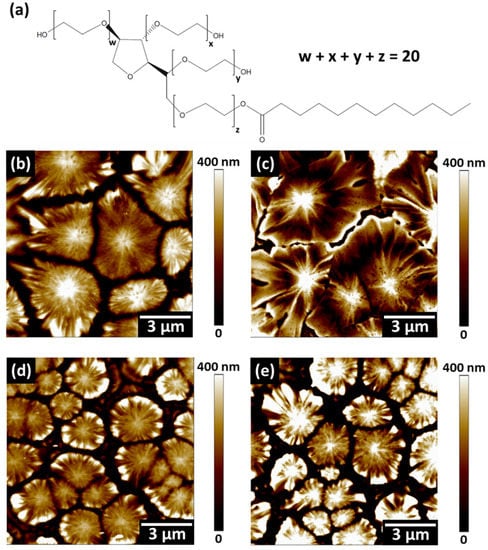 (a) Chemical structure of the surfactant Tween 20 and the AFM images of perovskite films with various Tween 20 concentrations, including (b) 0.0, (c) 1.0, (d) 2.0, and (e) 3.0 mM.