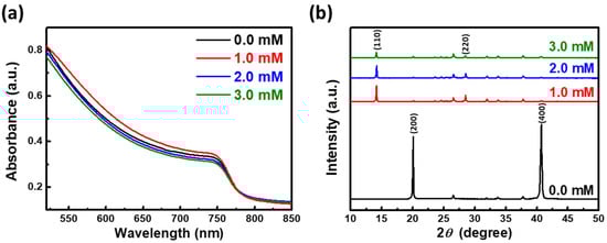 (a) UV–vis absorption spectra and (b) XRD patterns of pristine, 1.0, 2.0, and 3.0 mM Tween 20 perovskite films.