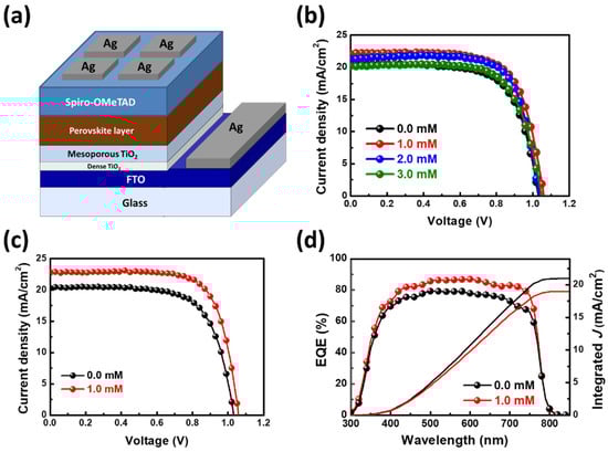 The schematic diagram and cross-section SEM image of the PSCs are shown in Figure 4a and Figure S3, respectively. It has the structure of an FTO/dense TiO2/mesoporous TiO2/MAPbI3 perovskite layer/spiro-OMeTAD/Ag electrode. The photovoltaic characteristics of the PSCs with various concentrations of Tween 20 in the perovskite films are shown in Figure 4b and Table 2. When the Tween 20 concentration increased from 0.0 to 1.0 mM, the short-circuit current density (JSC) increased from 19.89 to 21.46 mA/cm2, leading to a PCE of 15.75%. The improved photocurrent was due to the high absorption and uniform surface morphology (from Table S1) of the perovskite films with an appropriate amount of surfactant. On the contrary, the PCE of the PSCs with 3.0 mM Tween 20 remarkably decreased to 14.59%. When the Tween 20 concentration was increased to 3.0 mM, it led to the highest short-circuit current density (JSC) at 21.6 mA/cm2. The possible reason for the decrease in the PCE was the decreased crystal size due to an excess amount of Tween 20. The J-V curves of the champion pristine and 1.0 mM Tween 20 PSCs are shown in Figure 4c. For the pristine device, the J-V parameters were JSC = 20.30 mA/cm2, VOC = 1.031 V, FF = 69.3%, with a PCE of 14.51%, respectively. The maximum performances of the 1.0 mM Tween 20 PSC were JSC = 22.90 mA/cm2, VOC = 1.059 V, FF = 72.6%, with a PCE of 17.60%, respectively. The EQE spectra (Figure 4d) show that the integrated JSC of the 1.0 mM Tween 20 PSC is 21.00 mA/cm2.