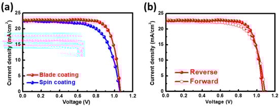 The lab-scale PSCs, which show great achievement in device efficiency, typically use spin-coating techniques in an inert glovebox environment. However, the spin-coating technique has a low throughput, wastes a large amount of precursor solution, and is unsuitable for preparing large-area PSCs. To enable continuous manufacturing, many large-area coating methods have been developed, including slot die [], blade coating [,,], inkjet printing [,], vacuum deposition [], and spray coating []. Among these scalable deposition technologies, the blade-coating method received more attention because it is compatible with roll-to-roll fabrication. In addition, the blade-coating method has the advantage of being a simple, cost-efficient, and low-temperature process. Unlike the spin-coating method, the blade-coating method can control the substrate temperature, the gap between the blade and substrate, and the coating speed for large-grain-size perovskite film [].