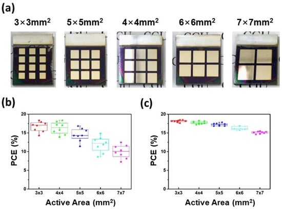 As previously mentioned, the thermal-assisted blade coating is suitable for fabricating large-area devices due to its coating uniformity. This advantage prompted us to fabricate PSCs with various active areas (Figure 6a), including 3 × 3, 4 × 4, 5 × 5, 6 × 6, and 7 × 7 mm2. The active areas versus the PCE of the 1.0 mM Tween 20 PSCs prepared by the two different methods are shown in Figure 6b,c. When the active area increased, the performance of the spin-coated PSC dropped dramatically, with a large standard deviation. However, the efficiency of large-area devices fabricated by the thermal-assisted blade-coating method was much more stable, meaning that this method produced high uniformity. These results were also in line with expectations.