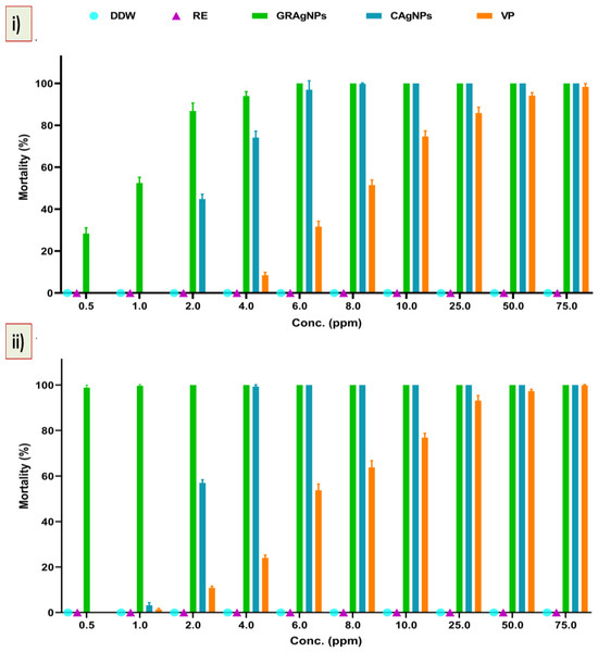 It was evident from the data that mortality rate was dependent upon the type of treatment, concentration, and exposure time. No nematicidal activity of RE was observed, whereas 100 % mortality was recorded at the lowest dose of 6.0 ppm, and 10.0 ppm in case of GRAgNPs, and CAgNPs, respectively, after 12 h of treatment. The commercial nematicide (VP) caused 98.0 % mortality at a relatively very high concentration of 75.0 ppm (Figure 5, panel (i)). It was observed that on increasing exposure time of treatment from 12 h to 24 h, 100% mortality was achieved at relatively lower concentrations. After 24 h, GRAgNPs exhibited a relatively very high mortality of 98.83%, 99.67% and 100% at 0.5 ppm, 1.0 ppm, and 2.0 ppm, respectively, whereas VP and CAgNPs did not exhibit any mortality at 0.5 ppm (Figure 5, panel (ii)). In contrast to GRAgNPs, VP and CAgNPs showed very little mortality, 1.33%, and 3.17% at 1.0 ppm, and 10.83%, and 57.0% at 2.0 ppm, respectively (Table S3 in the Supplementary Materials). After 12 h doses from 0.5 to 6.0 ppm were used to calculate LC-50 for GRAgNPs, CAgNPs and VP. LC-50 for GRAgNPs, CAgNPs and VP was found to be 0.805 ± 0.177, 2.849 ± 0.032, 8.325 ± 0.473 ppm, respectively (Figure 5, panel (iii)). GRAgNPs were observed to be the most efficient at 0.805 ppm to kill 50.0% of J2s, which is approximately 1/3rd of LC-50 of CAgNPs, and 1/10th of VP. The ordinary one-way ANOVA with Turkey’s multiple comparisons test showed statistically significant difference in median LC-50 doses in accordance with the treatment type, where F (2, 15) = 1061, p < 0.0001, R2 = 0.9930 at 95% confidence interval and α = 0.05 were observed (Figure 5, panel (iii)).