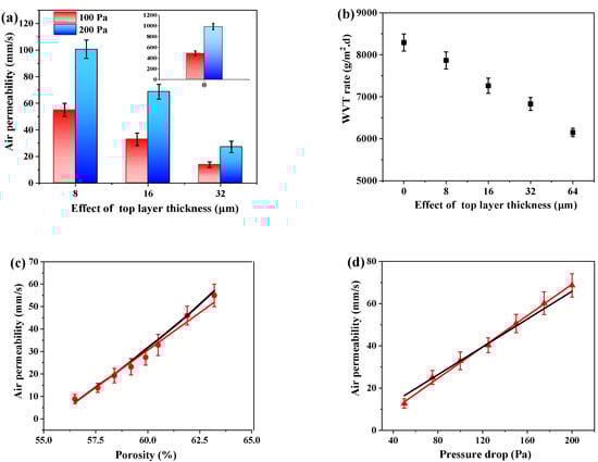 Above these mechanisms, the relationship between comfortable performance and each parameter was investigated. Figure 7a shows the air permeability of micro-/nano-fibrous composite membranes in relation to various TPU layer thicknesses. The control membranes showed outstanding breathable performance (489 mm/s) because of the porous structure of the microfiber. However, the micro-/nano-fibrous membranes demonstrated decreased breathability, owing to the increment of the accumulating density and channel length [13,32]. Notably, the breathability results showed that air permeability with a pressure drop of 200 Pa was twice as high as that of the breathability results with a pressure drop of 100 Pa. This finding was supported by the results shown in Figure 7c,d. Figure 7c shows that the porosity had a linear relationship to the air permeability: