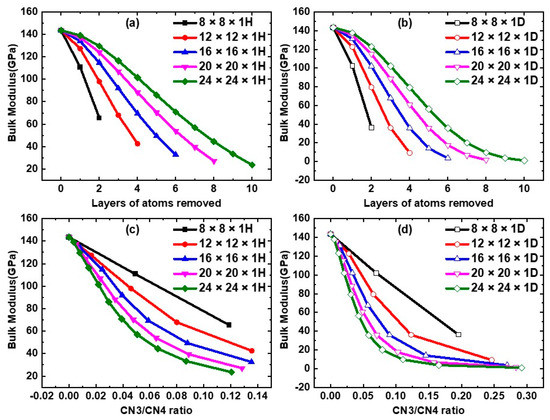 The bulk modulus is an important mechanical property and is a useful indicator of the hardness of a material [62,63,64,65,66]. The bulk modulus of the bulk ZnO obtained in this work is 143.5 GPa, which is in good agreement with previous experimental values (141 GPa [67] and 142.6 GPa [68]), as well as the previous PCRIM (143.5 GPa) [60], ReaxFF (144 GPa) [69], and ab initio calculations (127 GPa [29], 133.7 GPa [70], 149 GPa [71], and 161 GPa [72]). It was interesting to find that the bulk modulus is sensitive to the size and shape of the nanopores. The trends of the bulk moduli for the NPF-ZnO structures with differently sized and shaped nanopores shared several common features (Figure 2). Firstly, the bulk moduli of the NPF-ZnO structures decreased with the increasing size of the pores (decreasing density). Secondly, the decreasing trends of the bulk moduli were quite similar for the NPF-ZnO structures of different shapes, namely, the hexagon-prism shape and diamond-prism shape (n × n × 1H and n × n × 1D supercells). At the same density, the bulk moduli of the D-ZnO structure (n × n × 1D) were much smaller than those of the H-ZnO (n × n × 1H) NPF structures. which means that D-ZnO is softer than H-ZnO.