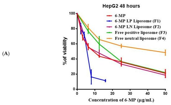 To determine the IC50 of free 6-MP and the prepared liposomal formulations, the percentage of vitality of HepG2, HCT116, and MCF-7 cells was determined after 48 h of treatment with various dosages of free and 6-MP loaded liposomes (Figure 1).