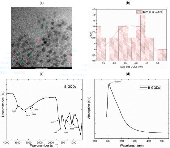The successful preparation of GQDs was confirmed by the results of FTIR analysis. The hydrothermally prepared B-GQDs were certainly water-dispersible due to the availability of hydroxyl and carboxylic groups on their surface, which was established by the FTIR examination [84]. As presented in Figure 5c, the peak formed at around 1386 cm−1 indicated the existence of –COOH, while the peak seen at about 3483 cm−1 arose from the bending vibrations of the O–H bonds. The two peaks observed at approximately 2943 cm−1 and 2888 cm−1 were related to the C–H bond’s stretching vibrations, and the peak that appeared at almost 1635 cm−1 was attributed to the benzene ring vibrations of C = C bonds. Additionally, the peak at 1568 cm−1 was due to the C = C stretching vibration of the aromatic ring, which established that the synthesized B-GQDs comprised aromatic rings. Furthermore, the peaks noted at 1283 cm−1 and 1035 cm−1 could be attributed to the vibrating absorption bands of C–O–C and C–O stretching vibrations in epoxides, respectively. These FTIR results of the B-GQDs were the same as those found by Shi et al. [84].