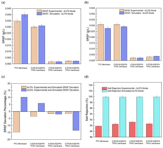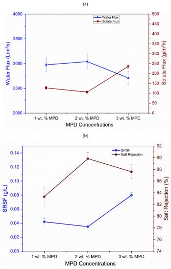 The impact of MPD concentration (1.0, 2.0, and 3.0 wt.%) used during the IP process on the forward osmosis performance (solute flux, water flux, salt rejection, and SRSF) of the TFC membranes was assessed in the AL-FS membrane orientation using a 1.5 M of NaCl DS and a 0.1 M of NaCl FS. The AL-DS mode is more desired as it is less prone to fouling and delivers a more stable water flux [76]. Moreover, the effect of incorporating three distinct wt.% of B-GQDs (0.025, 0.050, and 0.075 wt.%) in the PA layer on the FO performance of the developed membranes was assessed. These tests were performed in the AL-DS and AL-FS modes using a 1.5 M NaCl draw solution and a 0.1 M NaCl feed solution.