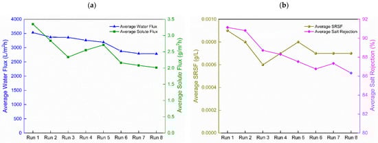 where Cp and Cf are the salt concentration in the feed and permeate, respectively; ΔP is the applied pressure across the membrane; and A is the water permeability calculated in Equation (6).