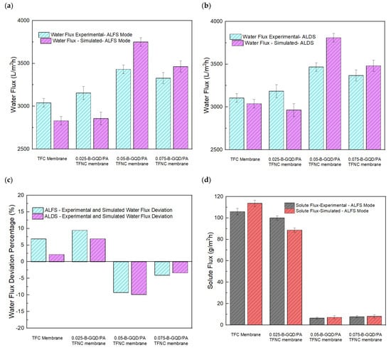 Figure 7d shows the CA values of the TFC and TFNC membranes. It was confirmed that the addition of B-GQDs significantly improved the hydrophilic properties of the selective PA layer. The CA of the membranes reduced from 77° (for thin-film composite membrane) to 66° (0.025-B-GQD/PA TFNC membrane) and 51° (0.05-B-GQD/PA TFNC membrane). The results from the FTIR analysis of the nanocomposite membranes confirmed that the hydroxyl-functional groups’ stretching vibrations were available in the B-GQDs, and this generated improved surface hydrophilic properties [105]. The CA value of the TFNC membranes decreased by 34% relative to the thin-film composite membranes. This substantial development in the surface hydrophilicity of the B-GQD-based TFNC membrane could have been due to the availability of functional groups with ample oxygen-consisting groups on the B-GQD surface [100]. Improving surface hydrophilic properties is an appropriate method to reduce the adhesion of fouling agents and therefore improve fouling resistance [103,106]. The contact angle values of the thin-film composite membrane and the TFNC membrane obtained in this study followed the same decreasing trend as that noted for membranes in a study performed by Seyedpour et al., where GQDs prepared via the direct pyrolysis of citric acid were employed [56].