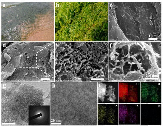 Figure 1a,b shows how the Enteromorpha prolifera (EP) invaded the seashore as well as the collected EP biomass in the salvage yard at Tsingtao City, Shandong Province of China. As depicted in Figure 1c, the fresh EP biomass exhibits a smooth surface without porous tissue structures; however, after the molten salt treatment (KCl), the prepared bio-carbon (EBC-K) exhibited sheet-like patterns with well-developed porous structures (Figure 1d). The SEM image with high magnification, shown in Figure 1e, shows the rich porous structures with diameters of several tens of nanometers; this was possibly caused by the etching effects of both the KCl and the oxygen which is penetrated through the molten salt []. Figure 1f depicts how the EBC-Na that was derived from NaCl molten salt demonstrates sheet-like patterns with porous structures that have diameters of ~100 nm. In addition, based on the TEM images displayed in Figure 1g,h, the EBC-K possesses regularly distributed mesoporous structures with diameters of 2–5 nm. The corresponding selected area, as shown in the electron diffraction (SAED) image, discloses two sets of indistinct diffraction rings that are attributed to the carbon lattice; this indicates that the EBC-K has a medium graphite structure. As indicated by the HAADF-STEM and EDS mappings of EBC-K (Figure 1i), C, O, N and S are found homogeneously distributed on the surface of the bio-char. As no N or S contented regents were adopted in the synthesis, the rich N and S originated from the intrinsic composition of the EP biomass. Moreover, slight amounts of Si and K could be also found embedded in the bio-carbon; this may also be ascertained from the intrinsic composition of the biomass (Figure S1).