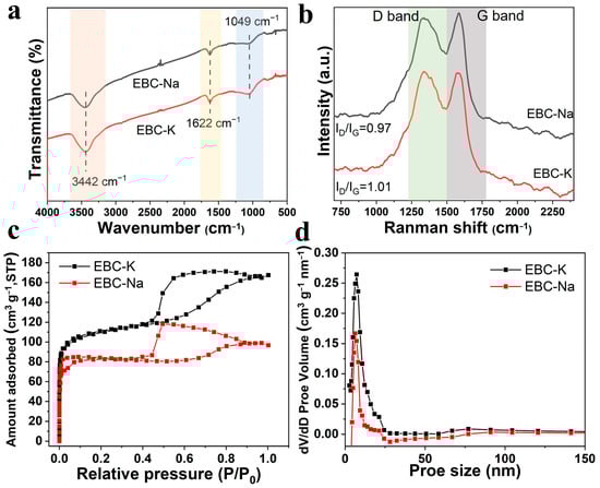 (a) FTIR and the (b) Raman curves of the EBC-Na and EBC-K. (c) N2 adsorption/desorption isotherms and (d) pore size distribution of EBC-Na and EBC-K.
