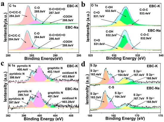 High resolution XPS spectrum of EBC-Na and EBC-K, (a) C 1s, (b) O 1s, (c) N 1s, and (d) S 2p.
