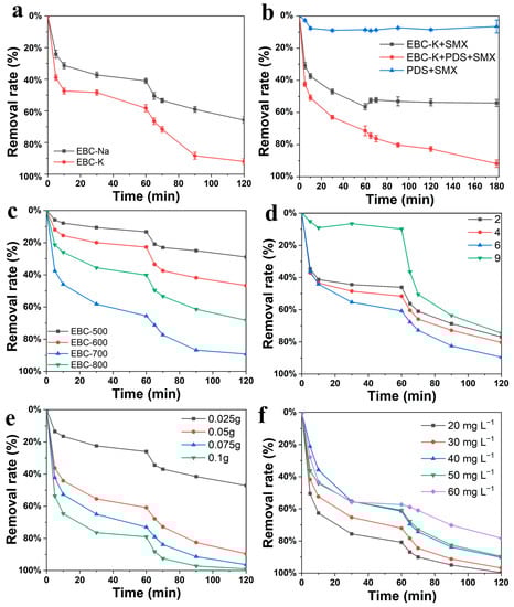 The PDS activation performances of the bio-carbons were explored by using SMX as the simulating pollutant. In order to better illustrate the adsorption and PDS degradation, the measurements were divided into two phases. After the adsorption reaches equilibrium after 60 min, the PDS was subsequently added into the system to start the AOP. As shown in Figure 4a, EBC-K shows a much higher adsorption capability as well as degradation process compared with that of EBC-Na. The overall removal rate could achieve up to 92.7% a significant improvement compared with the removal rate of EBC-Na (65.9%); therefore, the detailed optimization of the preparation parameters was carried out in the KCl system. Based on Figure 4b, it was found that without a catalyst, the SMX experiences no obvious degradation with the addition of PDS, thus indicating that the self-activation of PDS is rather low; however, for the degradation system without PDS, the removal of SMX is solely caused by the adsorption process, and the high adsorption capability of EBC-K (~50%) could facilitate the later degradation process. As demonstrated in Figure 4c, the EBC-700 that was prepared under 700 °C possessed the best performance. The higher pyrolysis temperature inevitably leads to the evaporation of the slat medium, which leads to lower adsorption and catalytic performances.