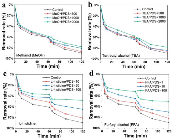 SMX degradation performances of EBC-K measured with different scavengers: (a) methanol (MeOH), (b) tert-butyl alcohol (TBA), (c) L-histidine, and (d) furfuryl alcohol (FFA). (Control, in the inset legends, represents the test without a scavenger, and the values represent the molar ratio between the scavenger and the PDS.).