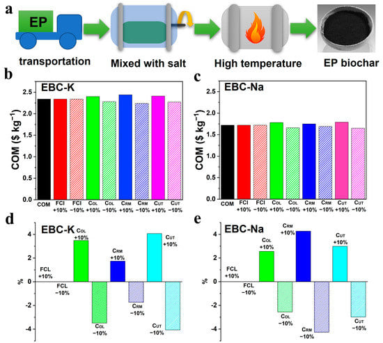 (a) The manufacturing processes of the bio-carbons derived from EP using the molten salt method; the COM of (b) EBC-K and (c) EBC-Na; the sensitivity analysis of the COM variation of (d) EBC-K and (e) EBC-Na upon the cost fluctuation with 10% increase or decrease.