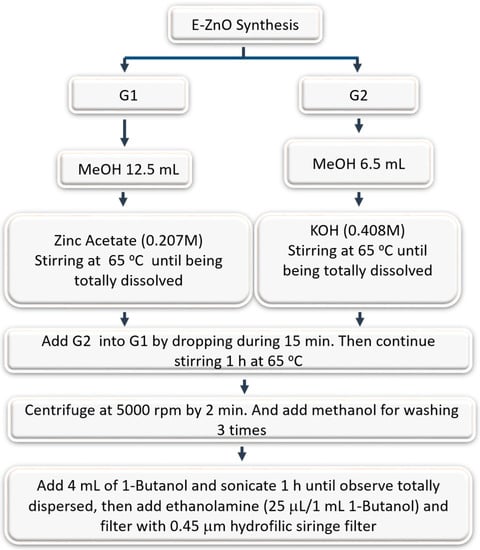 Additionally, it has been demonstrated that the ZnO synthesis method plays an important role in the performance of perovskite over time []. Several synthetic methods for ZnO NPs are reported []; most are characterized by high temperature, but the current goal is to synthesize these materials at lower temperatures than used for TiO2 or SnO2 processed in solution, making the methods suitable not only for large-scale processes with considerable energy savings, but also for deposition on flexible substrates [].