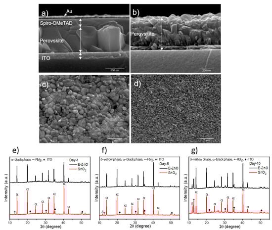 Representative SEM images of (a) SnO2-based FACsPI solar cell cross-section, (b) E-ZnO-based FACsPI solar cell cross-section. Top view of (c) FACsPI on the top of SnO2 and (d) FACsPI on the top of E-ZnO. Perovskite on the top of ZnO was not measured owing to lack of stability. X-ray diffraction patterns of the perovskite (FACsPI) over SnO2 and E-ZnO after (e) 1 day, (f) 5 days, and (g) 10 days.
