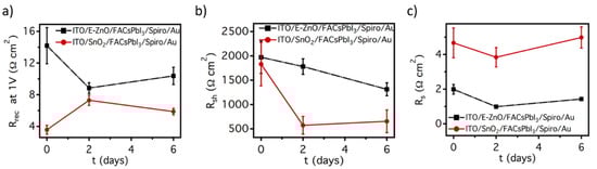 Temporal evolution of the (a) recombination, (b) shunt, and (c) series resistances, obtained from the simulation of the J/V curves measured for solar cells at 0, 2, and 6 days since their fabrication.
