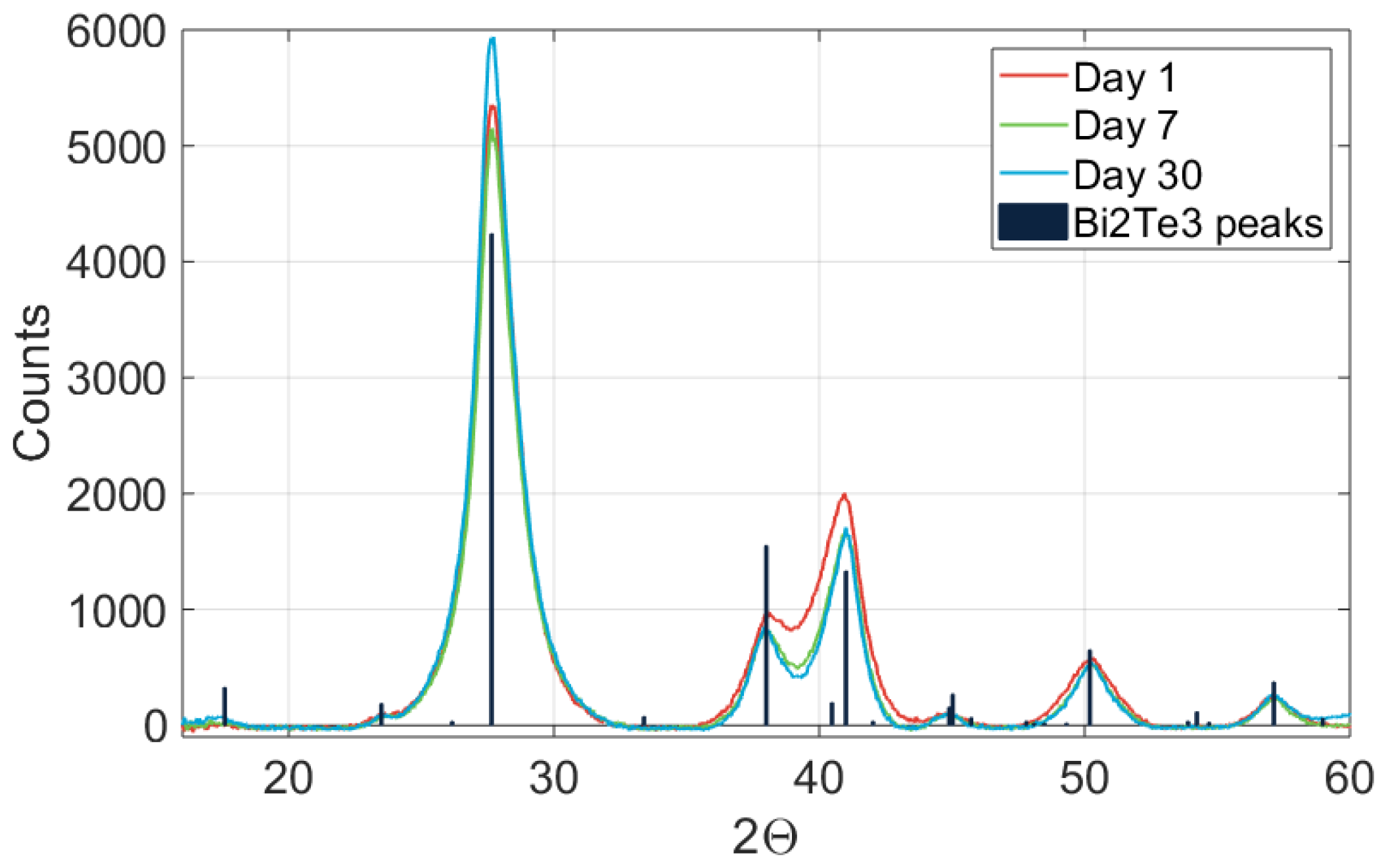 - Choudhary, K.K.; Sharma, U.; Lodhi, P.D.; Kaurav, N. Size effect on thermoelectric properties of Bi2Te3 nanoparticles. AIP Conf. Proc. 2018, 1953, 030275. [Google Scholar]