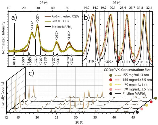 In the MAPbI3 perovskite films and CQD@PVK films, the existence of the tetragonal phase of MAPbI3 is confirmed through the sharp peaks at angles of 14.15°, 20.05°, 23.55°, and 31.95° for all samples, corresponding to the <110>, <200>, <211>, and <310> planes [,]. However, the peaks reveal a lower intensity (Figure 3c) and higher broadness (Figure 3b) in the CQD@PVK samples, indicating that the crystallization was perturbed by the CQDs’ embedment, leading to a higher bulk defect density. This is in accordance with previous CQD@PVK tests presented in the literature, from which it is expected that concentrations on the order of 1 mg/mL or higher (as used in this work) can significantly reduce the structural quality of the composite films [,,]. Nevertheless, when comparing the patterns of the CQD@PVK films, there is an increase in peak intensity with higher dot concentration, particularly for the 3.5 nm QDs, which is due to a more intense signal caused by a higher film thickness (see Table 1). Additionally, it is worthwhile to note that PbS peaks are not present in the CQD@PVK films, which is attributed to the much smaller fraction of PbS in the films compared to MAPbI3 (~10% solid mass in solution for 70 mg/mL and ~20% for 155 mg/mL). This, together with the aforementioned low crystallite size and random distribution of PbS CQDs in the CQD@PVK films, resulted in relatively high broadness and low signal intensity in the XRD patterns.