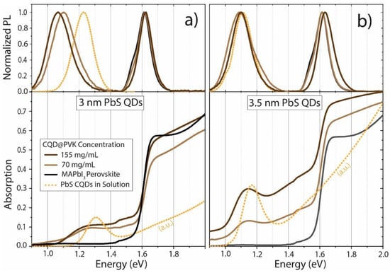 The optical absorption and photoluminescence spectra (Visible–NIR) of the composite films are shown in Figure 4, compared to the spectra of the as-synthesized CQD solution in toluene. Notably, for both QD sizes and concentrations in this study, the absorption and emission properties of the constituent materials (PbS QDs and MAPbI3) can be observed and clearly distinguished in the CQD@PVK composites. Specifically, the CQD@PVK composites exhibit the band-edge absorption and emission of MAPbI3 at 1.60 eV (host bandgap), as well as the ground-state absorption of the PbS QDs at 1.23 eV and 1.18 eV for 3 nm and 3.5 nm dots, respectively. Additionally, there is a noticeable redshifted PL emission from the former.