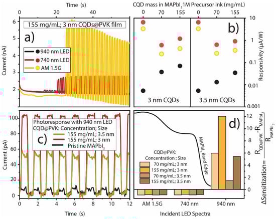 In terms of above-bandgap photoresponse (740 nm LED and AM 1.5 G), no significant differences are seen between the two diameters of CQD@PVK films, as the main source responsible for photogeneration in the visible range is the surrounding perovskite host. However, an increase in the visible response is observed with a higher concentration of QDs, which is mainly attributed to the higher thickness (Table 1) of CQD@PVK films, as mentioned in the optical analysis of Figure 4. For all the samples, it is noteworthy that the higher responsivity is achieved for the 740 nm incoming light due to the close proximity of such an LED illumination peak to the MAPbI3 bandgap (see Figure S3 in Supplementary Information), thus providing a favorable amount of carrier generation slightly above the conduction band minimum. On the other hand, with the broadband AM 1.5 G irradiation, the incoming photons are much more spectrally dispersed towards energies at which the material presents a low absorption coefficient (e.g., below bandgap). Consequently, the measured current over incident power (responsivity) is reduced.