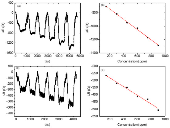 where Rgas and Rair are the resistance of the sensors when exposed to the target gas and air atmosphere, respectively; all the sensors’ performance measurements were conducted at room temperature, atmospheric pressure, and a relative humidity of around 42%.