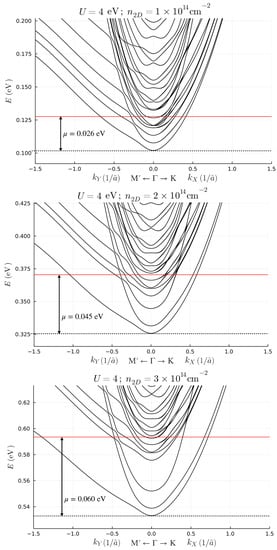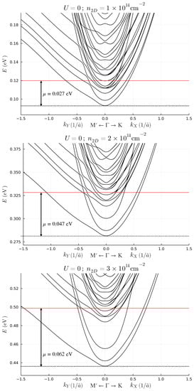 In order to clarify the effect of screening, we self-consistently obtain the eigenstates of the Hamiltonian (2) with the potential of Equation (5) for the three different benchmark parameters defined above. The band structures for low fillings, expressed in terms of the dimensionless quasi-momentum , are shown in Figure 2.