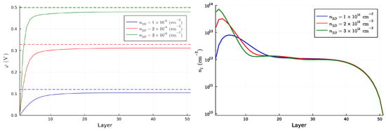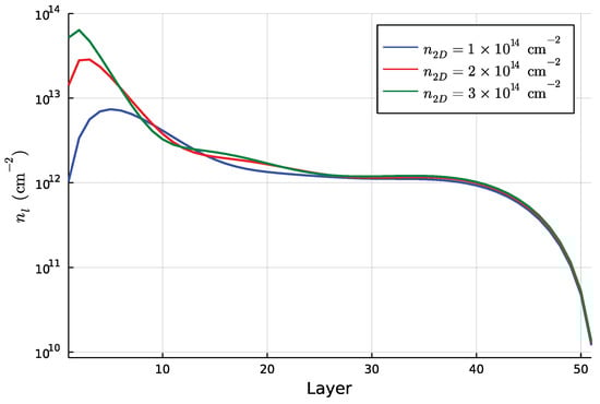 In order to include the confinement effects in a simple way, let us suppose to take the dielectric permittivity in Equation (6). By choosing cm we obtain V/m. We find from the relation that we confined the system over 7 layers. From Figure 3 we see that the peak of the density is located approximately between layers 5 and 7, which is in agreement with the analytical estimation. The splitting between the first eigenvalue and the subsequent (which gives the splitting between the in-plane sub-bands), is depicted in Figure A1 by varying the positive charge density at the interface. However by comparing the splitting of the self-consistent bands in Figure 2, we see that the predicted splitting is an order of magnitude higher that the self-consistent one.