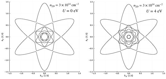 In Figure 4 we show the FSs of the band for the benchmark density cm. The contour shows a six-fold symmetry of the energy spectra and, in agreement with the analysis of ref. [,,], every ellipse-shaped band possesses a strong d-orbital character away from , while nearby the point the or character of the band is restored (i.e., the spherical symmetry of the inner bands), due to the trigonal crystal field.
