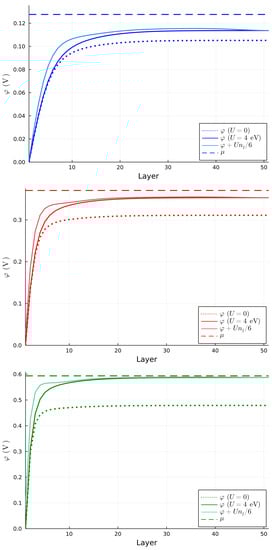 where , we exploited the spatial homogeneity in the interfacial plane so that mean densities are independent of positions, runs over the orbital degree of freedom, and U and parametrize the strengths of the interaction. In the absence of any term breaking the symmetry and the time-reversal invariance, for each layer the electron density is equal for every orbital and spin. In such a regime, the terms provide only a renormalization of the U term; therefore, we can neglect them reducing at the same time the computational effort for the simultaneous self-consistent calculation of the local Hubbard potential and the potential . Equation (7) shows that the local Coulomb interaction introduces an effective potential varying over each layer, proportional to the local particle density at that layer. We expect that this leads to a broadening of the electron density over the whole slab of material, since it energetically favours the lowest occupied layers.