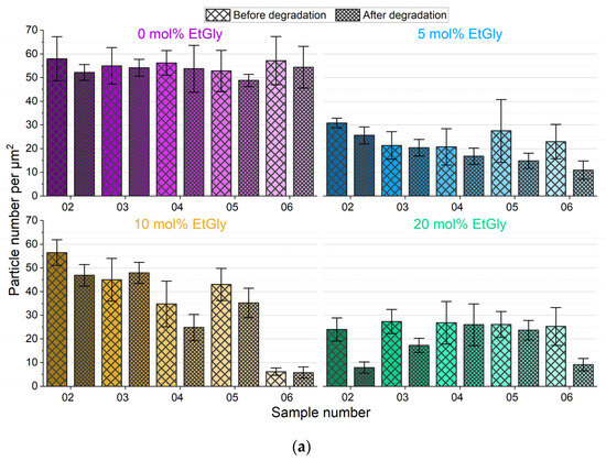 To further investigate the SC-PNP degradation, an additional experiment was conducted. In this experiment, the enzyme concentration was increased by a factor of 10 to 1 mg/mL and SDS solution was added to the proteinase K. Furthermore, the degradation test duration was set to seven days. Subsequently, the particle heights and the surface densities of the particles before and after degradation were evaluated and graphically represented, as shown in Figure 8. The particle heights showed minimal changes after degradation, with only a statistically significant difference observed for EtGly contents of 10 and 20 mol%. However, when considering the surface density of particles before and after degradation, a clear trend can be observed. After degradation, there are significantly fewer particles present on the substrate compared to before. Furthermore, the proportion of disappearing particles increases with a higher EtGly content, which might be due to the lower degree of crystallinity in the polymer. Based on the findings, it can be concluded that the SC-PNPs degrade in the presence of the proteinase K and appear to disintegrate either without or with minimal prior loss of size.