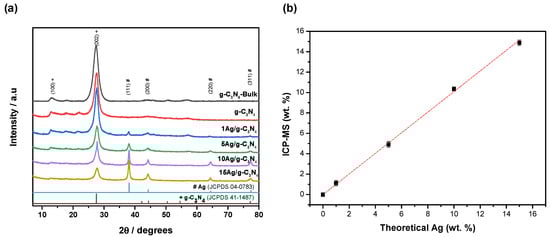 (a) X-ray diffraction patterns of g-C3N4-Bulk, g-C3N4, and xAg/g-C3N4 nanomaterials (+ and # correspond to g-C3N4, and Ag indexed peaks). (b) Chemical composition of the photocatalysts obtained by ICP-MS compared with theoretical content.