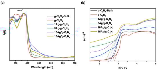 The UV–Vis diffuse absorption spectra of the bare g-C3N4 (bulk and thermoexfoliated) and xAg/g-C3N4 materials are shown in Figure 3. All samples show absorption peaks around 300–400 nm, assigned to π–π* transitions of the conjugated ring systems, including heterocyclic aromatics (Figure 3a). Upon comparing the xAg/g-C3N4 sample spectra with those of the reference materials, it is observed that the g-C3N4-Bulk and g-C3N4 show strong absorption in UV with an absorption onset at around 435 nm. In contrast, the xAg/g-C3N4 materials showed strong and extended absorption in the visible-light region and a red shifting of the absorption edge, which increases as the amount of silver over the thermoexfoliated g-C3N4 rises. In addition, the formation of an absorption band around 480 nm is appreciated, attributed to the plasmonic properties of the Ag nanoparticle agglomerates of a larger size (>10 nm) []. This is in accordance with results obtained by TEM, where some Ag nanoparticles are agglomerates that form secondary nanoparticles of a larger size.