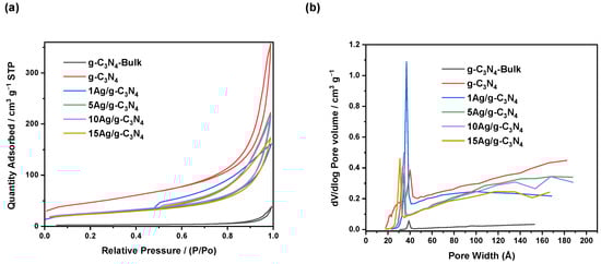 Figure 4 and Table 1 show the textural properties of the g-C3N4-Bulk, g-C3N4, and xAg/g-C3N4 photocatalytic materials. Figure 4a displays N2 adsorption–desorption isotherms and pore size distribution (Figure 4b) of the nanomaterials. According to the IUPAC classification, the isotherms of the samples (Figure 4a) correspond to isotherm type IV with apparent H3 hysteresis loops, indicating the existence of a mesoporous structure []. Table 1 summarizes the textural values of the photocatalysts, where the results reveal that the thermoexfoliation treatment applied to the g-C3N4-Bulk material increases the specific surface area from 9.2 to 143.8 m2 g−1 (g-C3N4). This result validates the effectiveness of the technique in obtaining more g-C3N4 nanosheets with a high specific surface area that can lead to better light absorption and accessibility to reactant molecules during the photocatalytic reaction. Regarding the as-prepared xAg/g-C3N4 materials, the incorporation of Ag nanoparticles into g-C3N4 generated a decrease of 40% (average) compared to g-C3N4. However, a trend of increasing or decreasing the specific surface area is not appreciated as silver concentration increases. Although considerable, the decrease in specific surface area is not significant, especially when considering the improvement in bandgap width obtained for all silver-containing materials. In the case of pore volume results, Figure 4b presents a monomodal distribution where the pore size decreased as the Ag content increased over the g-C3N4 surface, indicating that the deposition of Ag can block the pores of g-C3N4. Here, the pore volume value obtained for thermoexfoliated g-C3N4 (0.257 cm3 g−1) is higher than that obtained for the g-C3N4-Bulk (0.013 cm3 g−1). The values obtained for the samples that contain Ag nanoparticles are in the same order of magnitude (average of 0.182 cm3 g−1), without an increasing or decreasing trend of the silver concentration. Additionally, the textural properties of the g-C3N4 and Ag/g-C3N4 materials are more promising than those of the typical titania used as a reference in photocatalytic studies [].