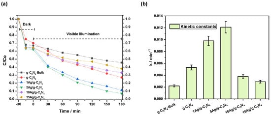 The photocatalytic experiments of g-C3N4-Bulk, g-C3N4, and Ag/g-C3N4 were evaluated via methylene blue degradation under visible-light irradiation. Figure 5a displays the concentration ratio C/Co as a function of reaction time, including a stabilization period under dark conditions. It is essential to highlight that in the absence of the photocatalyst, the degradation of MB is negligible after 180 min. Furthermore, it is observed that the photocatalysts present adsorption of the dye pollutant by ca. 25% to 30% under dark conditions, indicating that the adsorption ability of Ag/g-C3N4 towards MB molecules slightly enhances with Ag loading. The photodegradation results (visible illumination zone) show that the thermoexfoliation process allows for increasing the methylene blue remotion in the order of 20% more than the g-C3N4-Bulk material. Likewise, it can be seen that silver deposited on g-C3N4 thermoexfoliated modifies the photocatalytic behavior of the exfoliated graphitic carbon nitride nanosheets. Moreover, 1Ag/g-C3N4 and 5Ag/g-C3N4 photocatalysts managed to eliminate 89 and 94% of the methylene blue in 180 min. However, the incorporation of 10 and 15% of Ag nanoparticles decreases the photoactivity, obtaining less methylene blue remotion than the g-C3N4 material. The first-order kinetic constant was determined to evaluate the real photocatalytic activity of each nanomaterial, and the results are shown in Figure 5b. The value obtained for the thermoexfoliated graphitic carbon nitride (g-C3N4) is 2.6 times higher than that obtained with the g-C3N4-Bulk photocatalyst (0.002 min−1). In addition, as can be seen, the incorporation of 1 (0.010 min−1) and 5 (0.012 min−1) wt.% of silver nanoparticles improves the photocatalytic activity, obtaining the best performance with the 5Ag/g-C3N4 photocatalysts. Therefore, the photocatalytic results indicate that an optimum amount of silver enhances the adsorption of the colorant under dark conditions and its degradation under visible-light illumination.